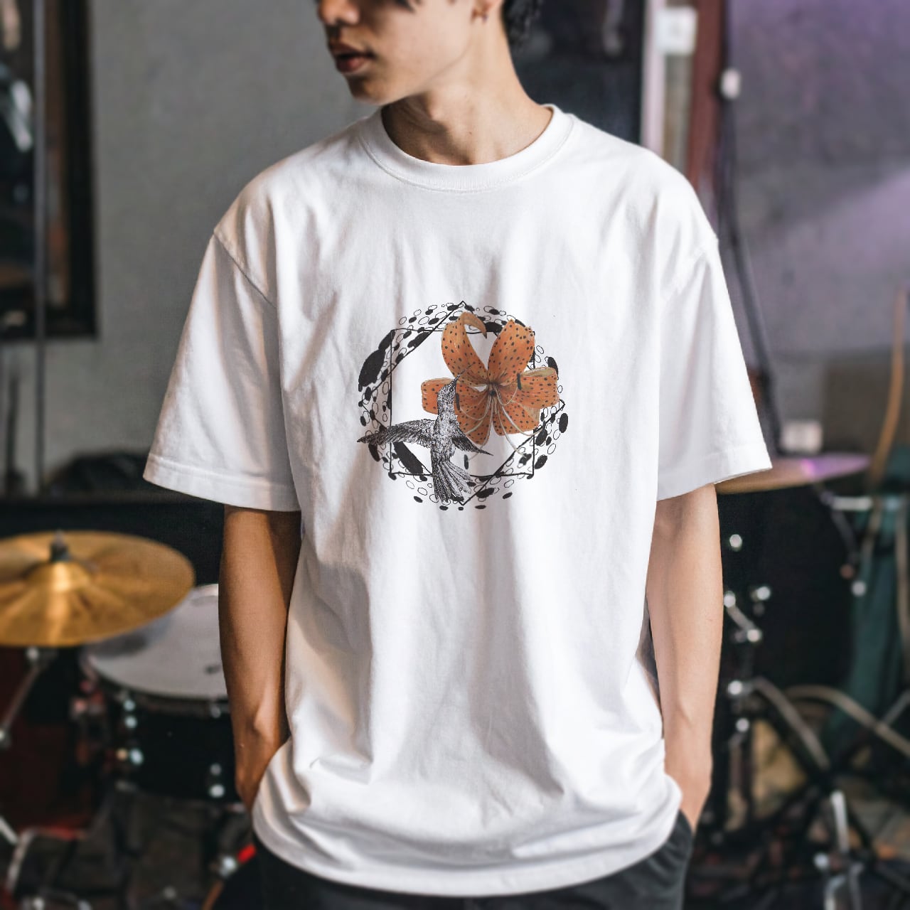 坂隼治によるハチドリとオニユリをモチーフにした繊細かつ力強いデザインを、フロントに大胆プリント。